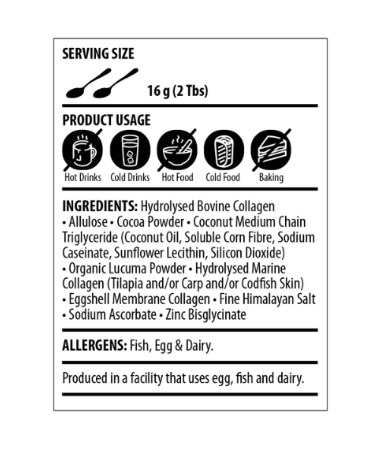 Hydrolysed Bovine Collagen, Allulose, Cocoa Powder, Coconut Medium Chain Triglyceride (Coconut Oil, Soluble Corn Fibre, Sodium Caseinate, Sunflower Lecithin, Silicon Dioxide), Organic Lucuma Powder, Hydrolysed Marine collagen [Tilapia and/or Carp and/or Codfish Skin], Eggshell Membrane Collagen, Fine Himalayan Salt, Sodium Ascorbate, Zinc Bisglycinate